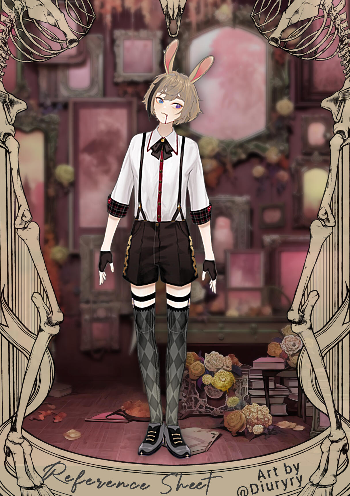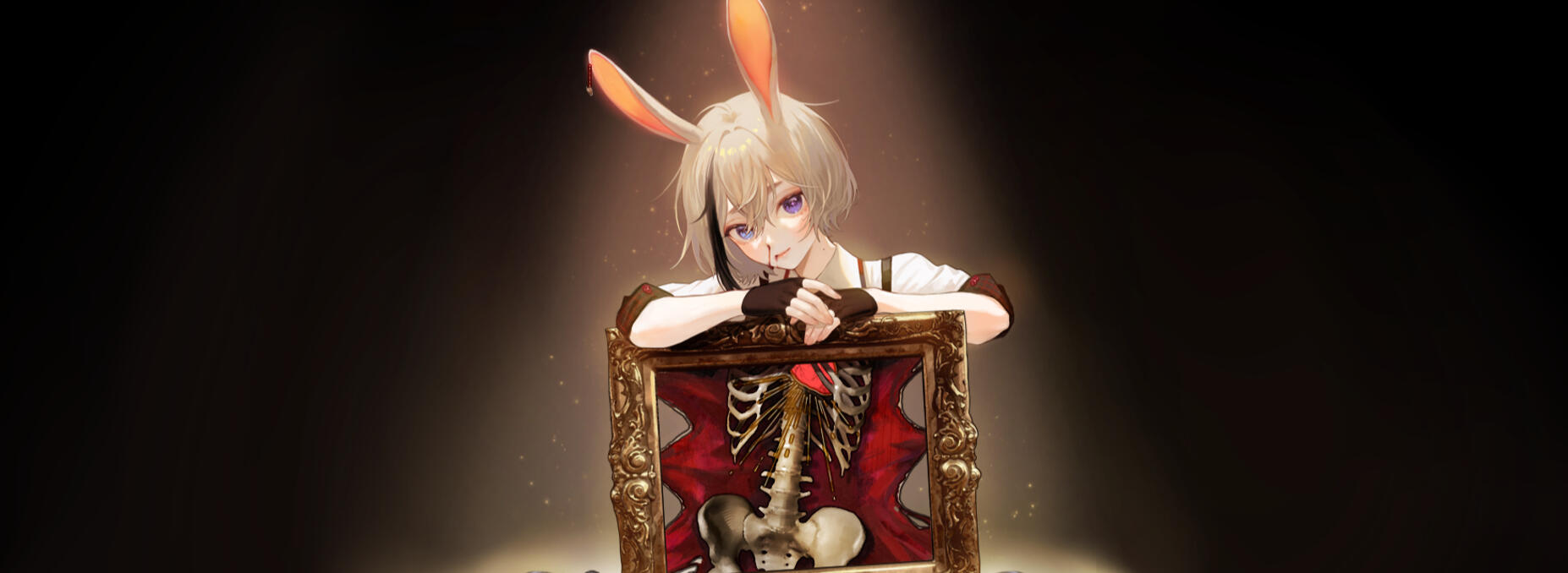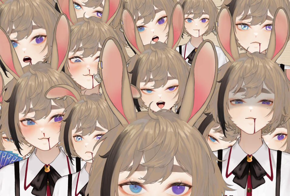✦ Um coelho sobrevivente de experimentos humanos que acolhemos no museu! Ele vai aparecer na live as vezes para a diversão (e talvez desespero) de vocês!Apesar da aparência assustadora, ele é um frágil coelho que ama abraços, mas detesta humanos com todas as suas forças. bem, não atoa, eles arrancaram toda sua pele, pálpebras, lábios e fizeram alguns outros experimentos.